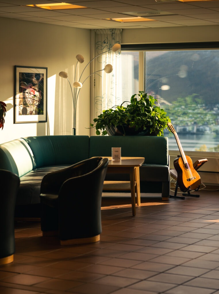 The design was inspired by the seafront views from the building, which became the foundation for the ripple motif. This motif appears beneath “Vi” (“We”) in the Vigør logo, symbolizing collaboration and collective support: We support. We strengthen. We recover.